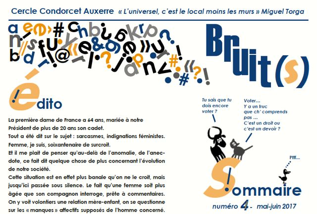 Le quatrième numéro de la revue « BRUIT(s) » éditée par le Cercle Condorcet d'Auxerre est publié. Il vous est offert, il suffit de le consulter
